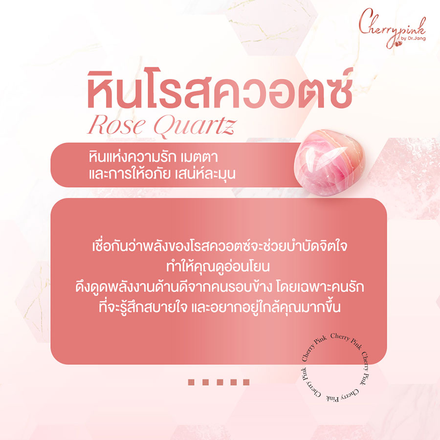 หินสีชมพูอ่อนละมุนนี้ขึ้นชื่อว่าเป็น "หินแห่งความรักและการให้อภัย" เชื่อกันว่าพลังของโรสควอตซ์จะช่วยบำบัดจิตใจ ทำให้คุณดูอ่อนโยน มีเมตตา และดึงดูดพลังงานด้านดีจากคนรอบข้าง โดยเฉพาะคนรักที่จะรู้สึกสบายใจและอยากอยู่ใกล้คุณมากขึ้น